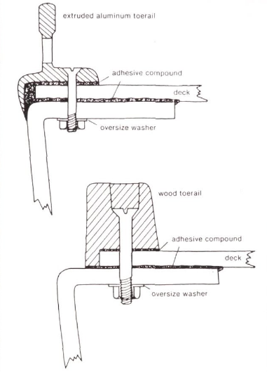 By far the simplest and strongest hull-to-deck joint is the inward-turning hull flange at deck level, with the deck laid over it and the two thoroughly bedded and through-bolted at close intervals. This joint can be covered by a wooden toe rail, whose through fastenings form part of the mechanical hull-to-deck joint, or it can be covered by an aluminum extrusion specifically designed for the purpose.