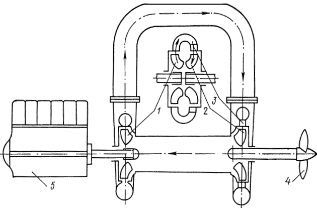 Двигатель приводит во вращение рабочее колесо насоса 1, которое сообщает жидкости энергию и направляет поток жидкости через неподвижный направляющий аппарат 3 в гидравлическую турбину 2. В последней, жидкость приводит во вращение рабочее колесо турбины и связанный с рабочим колесом Руль и гребной винт суднагребной винт судна. Из турбины жидкость снова возвращается в насос.