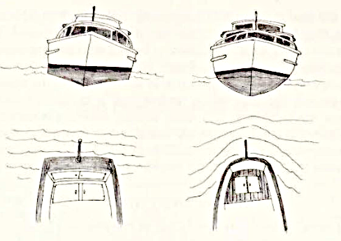 The shape of the stern dictates how much effect a following sea has on a boat’s steering and stability underway. Most sterns on modern powerboats feature large, flat transoms to allow greater room in cockpits and aft cabins – creating a little «more boat for the buck» from many perspectives. These large transoms often have square corners which tend to catch a following sea. The result is that the stern gets pushed to either starboard or port and steering corrections must be made to stay on course and to avoid broaching into the oncoming waves. A stern with a round shape or at least rounded corners allows following seas to pass under the transom with less effect on the boat’s course and steering.