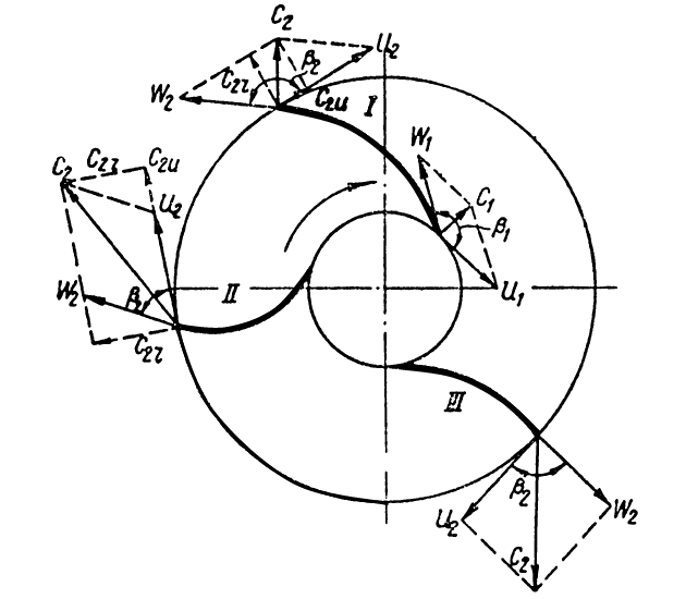 При β2>90° лопатки имеют форму, загнутую назад, при β2<90° лопатки загнуты вперед и при β2 = 90° имеют радиальный профилирующий угол.