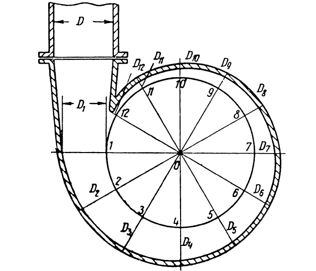 и т. д. Соединяя полученные точки плавной кривой, вычерчиваем внутренний контур спирального канала. Если сечение канала не является кругом, при построении вместо диаметров необходимо пользоваться площадями.