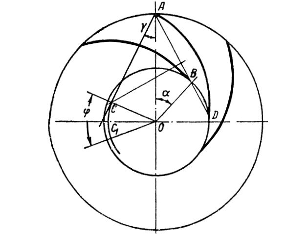 определяющий точку B на внутренней окружности. Точки A и B соединяются прямой, продолжаемой до вторичного пересечения с внутренней окружностью в точке D. Отрезок AD делится пополам и из середины его восстанавливается перпендикуляр до пересечения с лучом, проведенным под углом γ к радиусу. Из точки пересечения C радиусом CA очерчивается рабочая сторона лопатки. Для построения другой лопатки через точку C проводим вспомогательную окружность и от радиуса OC откладываем угол: