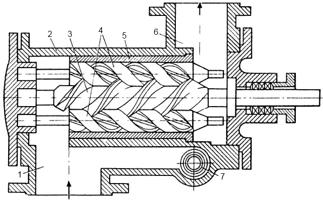 У трехвинтового насоса с односторонним подводом жидкости средний винт 3 является ведущим, а 2 боковых 4 – ведомыми. Нарезанные части винтов заключены в обойму (втулку) 5, вставленную в корпус 2. В обойме винты вращаются, как в подшипниках с небольшими зазорами. Корпус насоса имеет приемную камеру 1 с приемным патрубком и напорную камеру 6 с напорным патрубком. Эти камеры соединены предохранительно-перепускным клапаном 7.