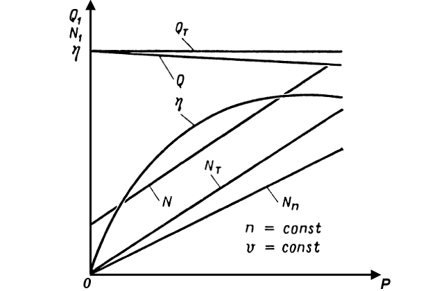 Теоретическая мощность Nт пропорциональна давлению p и изображается наклонной прямой, проходящей через начало координат. Разность ординат между кривой N и прямой Nт дает значение мощности Nтр, затрачиваемой на преодоление механических потерь. Полезная мощность насоса изображается линией Nп. Разность ординат между линиями Nт и Nп определяет потерю мощности, вызываемую утечками жидкости. Гидравлические потери в винтовом насосе невелики, поэтому их объединяют с механическими потерями и учитывают механическим КПД ηм. КПД насоса: