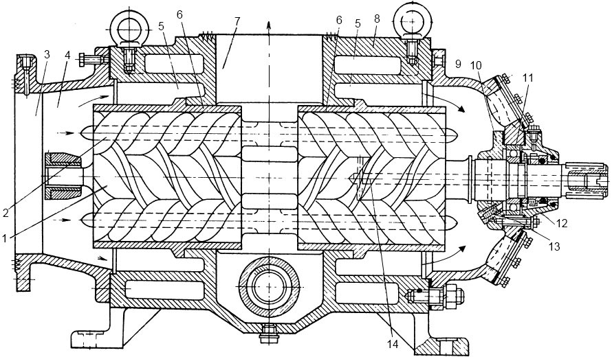 Насос имеет один ведущий винт 1 и 2 ведомых винта 2. Винты имеют по две нарезки противоположного направления. Всасывание жидкости происходит по концам, а нагнетание – в середине через патрубок 7. Такая конструкция обеспечивает полное уравновешивание осевой силы. Всасываемая насосом жидкость поступает к винтам 1 и 2 через приемный патрубок 3 и с противоположной стороны через внутренние каналы 5, сообщающиеся со всасывающей полостью насоса. Шариковый подшипник 11, установленный в крышке 9 корпуса 8, и подшипник скольжения 4, находящийся в центральной части перемычки приемного патрубка, служат опорами ведущего винта. На участках винтов с резьбой опорами служат бронзовые обоймы 6.