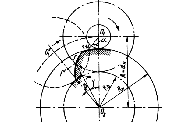 При любых абсолютных размерах ведущего и ведомых винтов трехвинтового насоса геометрические размеры их нарезки выполняются всегда соответственно подобными между собой, причем за исходную величину принимается диаметр начальной окружности dн винтов (образующих шестерен), который является также наружным диаметром ведомого винта (ведомой образующей шестерни). Подобие геометрических размеров облегчает расчет и нормализацию, как самих насосов, так и инструментов для изготовления винтов.