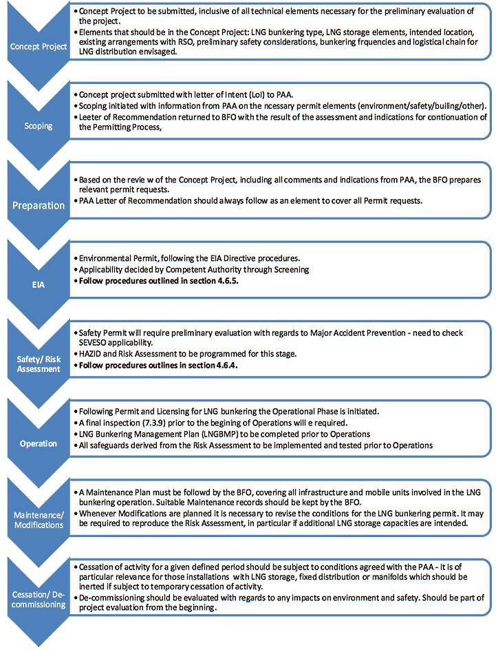 It is the objective of the present section to define a general permitting process, based on the Life-Cycle of LNG bunkering projects. The permitting process here suggested as indicative cannot be taken directly as representing any actual procedure in practice, or directly representing the permitting process in any Member State.