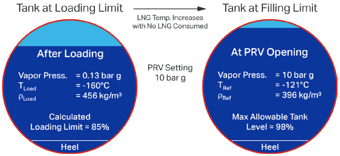 If the tank temperature is allowed to increase unchecked, the pressure in the tank will increase to the point where the pressure relief valves open. The temperature of the LNG at this point is the reference temperature. Because the density of the LNG at the reference temperature is lower than the density at the loading temperature, and given the formula for the loading limit, it is clear that the loading limit will always be lower than the filling limit.