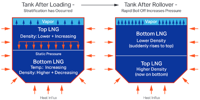 receiving ship, rollover and density variation can be a hazard when bunkering LNG fuel because LNG density changes significantly with change in temperature and as a result of gas boil-off. A hazardous rollover incident can occur when LNG with different density from that in the tank is bunkered without properly mixing the LNG in the tank during the bunkering operation. If a rollover incident occurs, rapid gas boil-off and the subsequent generation of large amounts of vapor could lead to gas release through the pressure relief valves or impair the tank containment. This is more of a risk while a vessel is stationary than for a rolling vessel at sea because the vessel motion will cause mixing. Measures as described in the bunker operation sections of this Advisory should be used to properly mix new and old LNG.