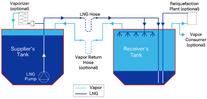 Methods of filling LNG storage tanks have been developed wherein there is no vapor emitted from the tanks, or the vapor is returned to the bunkering vessel or terminal. Lines used for bunkering must at the completion of bunkering be drained of LNG and the remaining gas vapors removed using nitrogen. Any liquid remaining in the pipes that is trapped between closed valves will boil and expand to fill the space available. If that space is small, the pressure developed by the expanding vapor can increase to dangerous levels and cause the pipes to burst or valves to be damaged. Where there is a risk of natural gas pressure buildup, such as LNG storage tanks and piping systems, relief valves are required to safely allow the excess pressure to be released as a final safety measure. Relief valves should be properly located so the hazardous zone created by the release of vapor is not near any operational areas aboard the vessel. In general, relief valves should tie into a vent mast which directs the gas away from all critical areas.