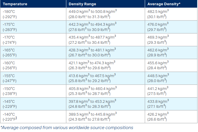 Bunkering (Loading) Temperature: At atmospheric pressure, natural gas will liquefy at a temperature of about -162 °C (-260 °F). As LNG increases in temperature, its vapor pressure increases and its liquid density, decreases. These physical changes need to be considered because they may increase the required storage tank volume and pressure rating.