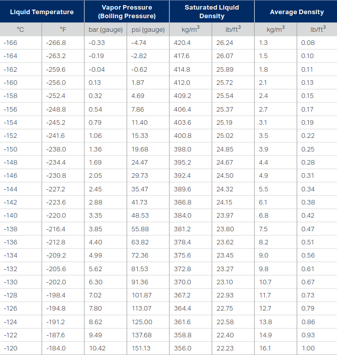 Reference Temperature: The reference temperature is the temperature corresponding to the saturated vapor pressure of the LNG at the set pressure of the pressure relief valves. For example, if the LNG tank has a pressure relief valve set pressure of 0,7 barg (10,15 psig), then the reference temperature is -154,7 °C (-246,4 °F), which is the temperature that natural gas will remain a liquid at 0,7 barg (10,15 psig).