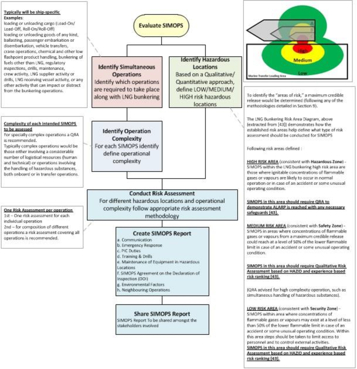 | HIGH RISK AREA (consistent with Hazardous Zone) | SIMOPS within the LNG bunkering high risk area are those where ignitable concentrations of flammable gases or vapours are likely to occur in normal operation or in case of an accident or some unusual operating condition. | SIMOPS in this area should require QRA to demonstrate ALARP is reached with any necessary safeguards. |