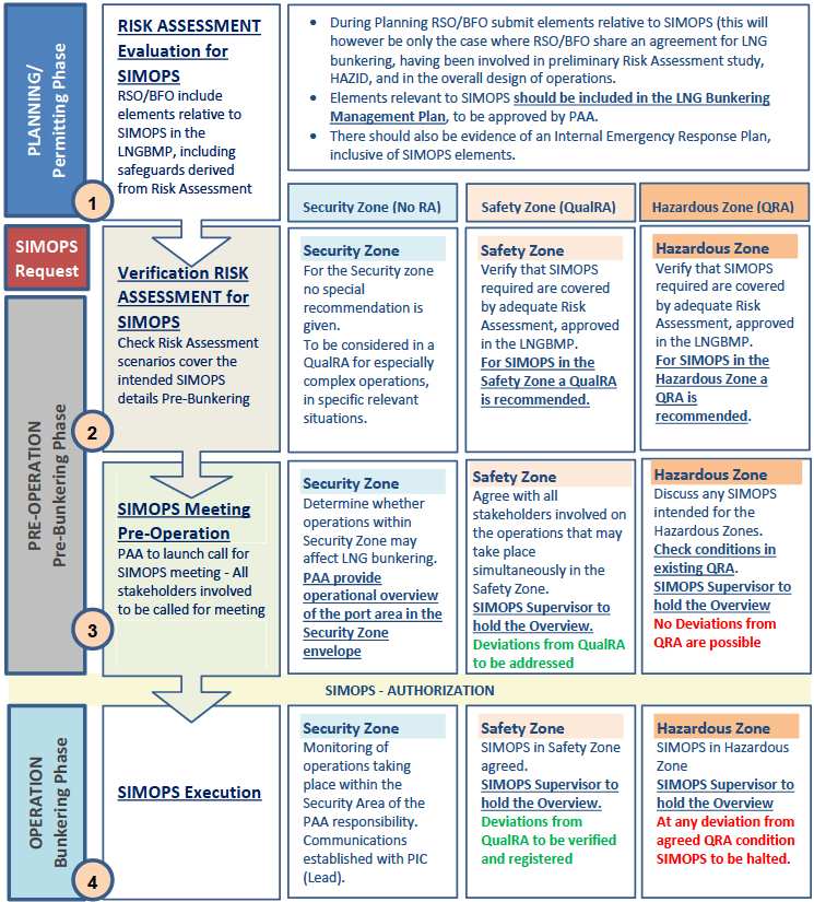 The diagram in figure 6 presents a staged approach for SIMOPS evaluation and authorization, considering the different Control Zones. From the Planning Phase down to the Operational stage, for LNG bunkering execution, the diagram below outlines a process structure to evaluate and authorize SIMOPS.