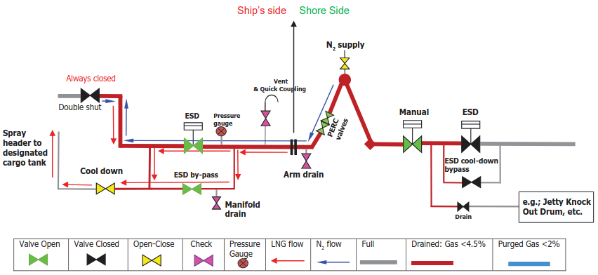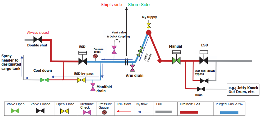 To achieve this all piping space between ship’s ESD valve, ESD by-pass valve and liquid MLAs isolating valve, prior to disconnection, must be measured by a suitable gas meter at less than 2 % gas content in a nitrogen background.