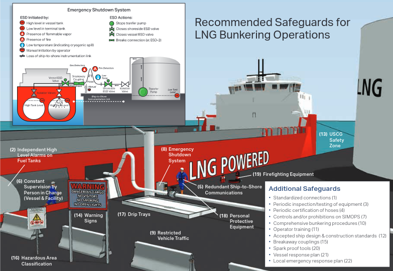Historically, carriage and the transfer of maritime LNG have an outstanding safety record, and the safeguards associated with LNG import/export terminals are proven. While LNG bunkering involves far lower quantities and transfer rates when compared to import/exports, many of the safeguards apply to help ensure safety (Figure 1).