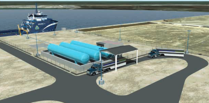 Note: NFPA 59A also provides requirements for such tanks. Initial plans call for the facility storage tanks to be filled with LNG brought to the facility by trucks, although transfer to and from barges is planned in later phases of the project. Aside from the primary role of supplying vessels that support the oil and gas industry, the facility will be capable of supporting over-the-road vehicles that operate on LNG.