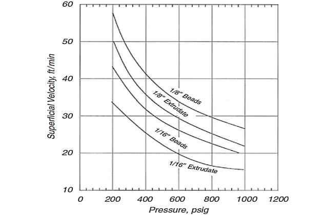 The design pressure drop across the entire bed should be about 5 psi; values higher than approximately 8 psi are not recommended. Most designs are based on a ∆P/L of about 0,31-0,44 psi/ft and typical superficial gas velocities of 30-60 ft/min.