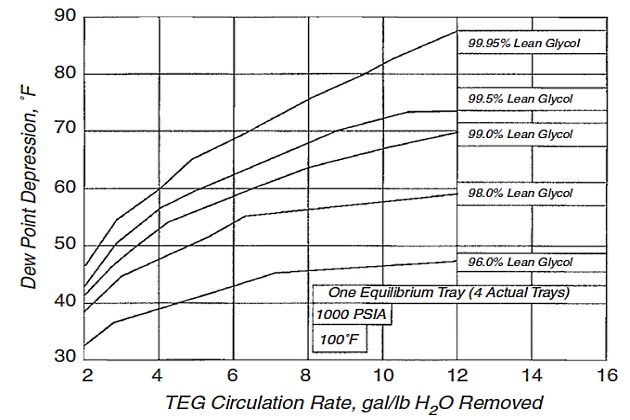 The amount of water to be removed in a TEG system is calculated from the gas flow rate, the water content of incoming gas, and the desired water content of outgoing gas. The water removal rate, assuming the inlet gas is water saturated, can be determined as: