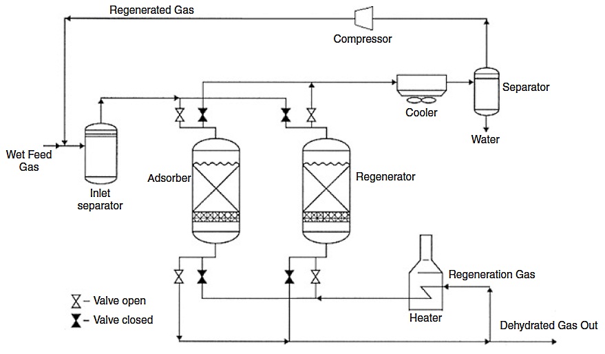The flow scheme of a typical solid adsorbent-based dehydration process is shown in Figure 7. The process is conducted alternately and periodically, with each bed going through successive steps of adsorption and desorption. During the adsorption step, the gas to be processed is sent on the adsorbent bed, which selectively retains the water. When the bed is saturated, hot gas is sent to regenerate the adsorbent. After regeneration and before the adsorption step, the bed must be cooled.