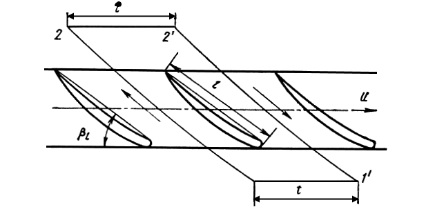 Принятие гипотезы о цилиндричности течения позволяет, развернув на плоскость соответствующий элементарный слой, перейти к рассмотрению плоской задачи. Развернув цилиндрическое (произвольного радиуса r) сечение лопастей колеса на плоскость (см. рис. 1), получим плоскую прямую бесконечную решетку профилей (рис. 2).