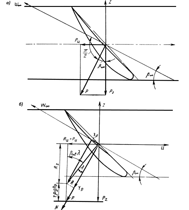 - Cy р и Cx р – безразмерные коэффициенты подъемной силы и лобового сопротивления профиля в решетке;
