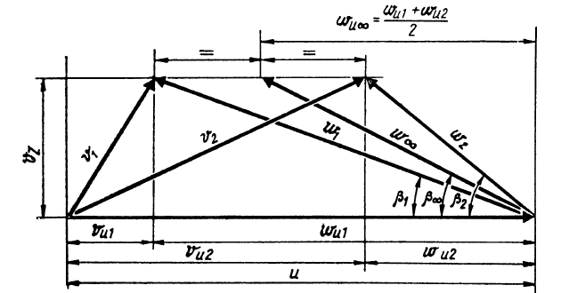 Скоростные треугольники осевого насоса являются ключевым инструментом для анализа течения. Относительная скорость w∞ равна среднему геометрическому значению относительных скоростей до решетки w1 и за ней w2. Она играет в теории решеток ту же роль, что и скорость на бесконечности в случае обтекания единичного профиля. Значение и направление этой скорости определяются из треугольников скоростей: