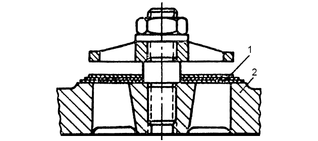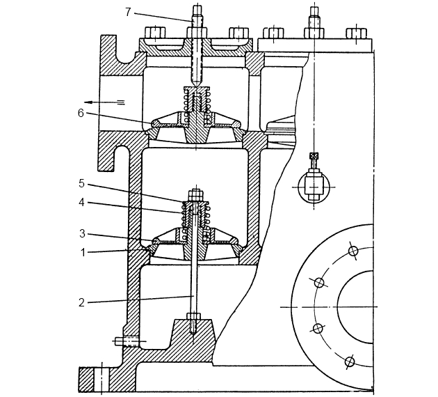 Бронзовое гнездо 1 всасывающего клапана прижимается к расточке корпуса нарезной шпилькой 2 с латунными гайками.