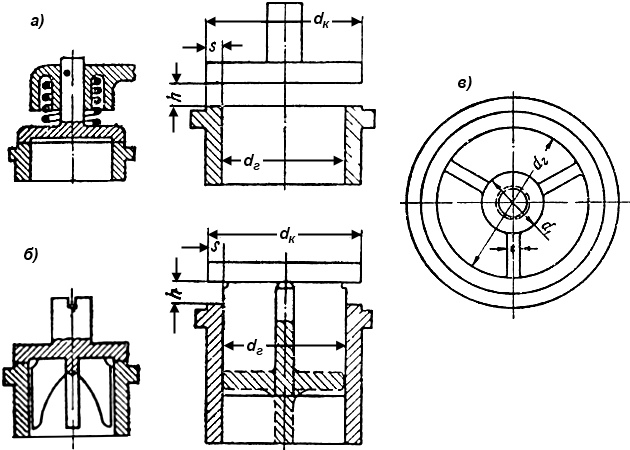 Диаметр гнезда конического клапана с верхней направляющей (рис. 12, а, в) определяется по общей формуле: