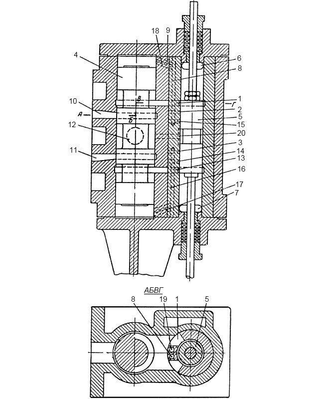 Гнездо нагнетательного клапана 6 прижимается к посадочному месту в корпусе нажимным болтом 7. Аналогичное конструктивное исполнение имеют клапаны для другой полости водяного насоса, помещенные справа.