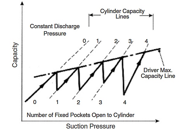 If the driver is a constant speed electric motor, the capacity control consists of either inlet valve unloaders or clearance unloaders. Inlet valve unloaders can hold the inlet valve into the compressor open, thereby preventing compression. Clearance unloaders consist of pockets that are opened when unloading is desired. The gas is compressed into them at the compression stroke and expands back into the cylinder on the return stroke, thus reducing the intake of additional gas and subsequently the compressor capacity. Additional flexibility is achieved using several steps of clearance control and combinations of clearance control and inlet valve control. Figure 4 shows the control characteristic of such a compressor.