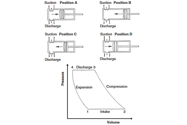 A reciprocating compressor is a positive displacement machine in which the compressing and displacing element is a piston moving linearly within a cylinder. The reciprocating compressor uses automatic spring-loaded valves that open when the proper differential pressure exists across the valve. Figure 1 describes the action of a reciprocating compressor using a theoretical pressure-volume (PV) diagram. In position A, the suction valve is open and gas will flow into the cylinder (from point 1 to point 2 on the PV diagram) until the end of the reverse stroke at point 2, which is the start of compression. At position B, the piston has traveled the full stroke within the cylinder and the cylinder is full of gas at suction pressure. Valves remain closed. The piston begins to move to the left, closing the suction valve. In moving from position B to position C, the piston moves toward the cylinder head, reducing the volume of gas with an accompanying rise in pressure. The PV diagram shows compression from point 2 to point 3. The piston continues to move to the end of the stroke (near the cylinder head) until the cylinder pressure is equal to the discharge pressure and the discharge valve opens (just beyond point 3). After the piston reaches point 4, the discharge valve will close, leaving the clearance space filled with gas at discharge pressure (moving from position C to position D). As the piston reverses its travel, the gas remaining within the cylinder expands (from point 4 to point 1) until it equals suction pressure and the piston is again in position A.