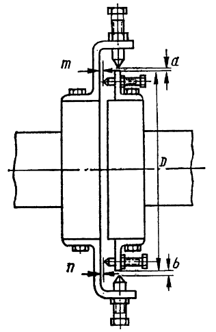 В первом случае измеряют щупом зазоры между линейкой, плотно прижатой к выступающему фланцу, и образующей цилиндрической поверхности другого фланца. Излом определяют измеряя щупом расстояние m и n, а также диаметр фланца.