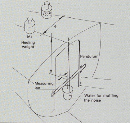 There are two methods for the practical interpretation of GM, both of which are easy to perform even on a yacht that is already afloat. In method l the yacht is heeled on a calm day with all equipment, i. e. gear, crew and half-filled tanks. The boat is tied loosely to the mooring and a weight is placed on to the side deck and shifted from the middle towards the side (you can use the crew!), so that the boat heels visibly. The measuring device for the heeling angle is a pendulum that is installed below deck (string with a small weight). The metacentric height in metres is obtained by using the heeling weight m (about 150 kg for a 10 metre yacht), the length of the shifting way on deck e, the swing of the pendulum s, the length of the pendulum l and the displacement of the yacht V: