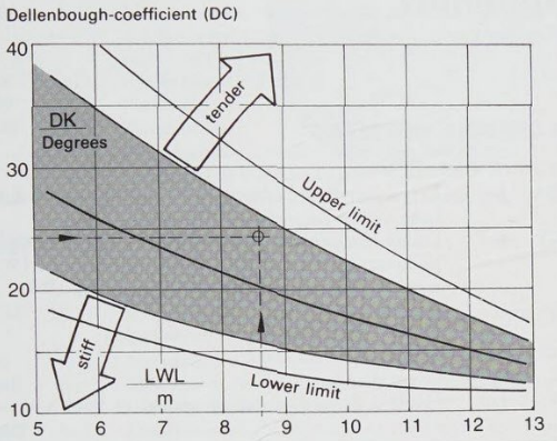 The Dellenbough-coefficient is the practical counterpart of the sail- carrying number made up from the sail area and displacement, which also indicates the comparative value as to whether a yacht is tender or stiff.