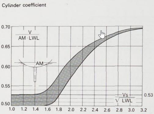 The cylinder coefficient describes the fullness of the hull, by dividing the overall resistance V through the length AM of the midship section multiplied by the LWL. The formula for the cylinder coefficient is therefore: V/AM × LWL. If it is applied to the speed-to-length ratio, the optimal values first produce a shallow curve and then a steep rising curve, as a criterion for the wave-producing resistance. The cylinder coefficient is between the value of 0,50 and 0,70, depending on the relative speed (VS/√LWL) the boat was designed for. Heavy displacement yachts have narrow ends, which correspond to a low coefficient, while modern light displacement yachts, which achieve higher speeds on a broad reach or on a run, have fuller ends and therefore a higher coefficient. Pure fair-weather yachts that sail with slow speeds have a value of between 0,50 and 0,53. Cruisers with values between 0,53 and 0,55 have good all-round qualities. Each speed had its corresponding cylinder coefficient: high values (up to 0,7) if the ends have a large displacement, as do light displacements with wide aft sections for planing. Unfortunately, the cylinder coefficient is not easily established, at least not at boat shows, but if some dealers use it for advertising they should at least state it in their brochure.