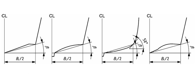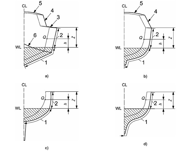 ANMERKUNG: Für Rundbilgen gilt die äußere Begrenzung oder Kimm als der Punkt, an dem eine Tangente 50° zur Horizontalen den Rumpf tangiert.