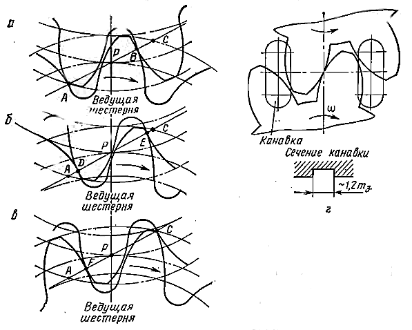 На рис. 2 показано изменение защемленного объема от начала вступления в зацепление новой пары зубьев в точке А, когда возникает защемленный объем (рис. 2, а), до момента выхода из зацепления предыдущей пары в точке C (см. рис. 2, в).