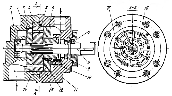 Корпус насоса состоит из двух частей 11 и 14, соединенных винтами, и имеет уплотняющее кольцо в плоскости разъема. В корпусе закреплено статорное кольцо 4 и смонтированы бронзовые торцевые диски 2 и 12. Диск 2 со всасывающими окнами 3 неподвижный, а диск 12 прижимается к торцу ротора 5 пружинами 10. Диск 12 имеет нагнетательные окна 15, а его ступица уплотнена резиновым кольцом. Вал уложен на шарикоподшипниках 1 и 9, а отверстие для выхода вала из корпуса уплотнено манжетой 7. На шлицах вала 8 посажен ротор 5, в пазах которого помещены пластины 16.