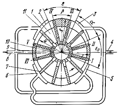 Насос работает следующим образом. Объем, заключенный между ротором, статором и двумя пластинами I и II, при вращении ротора против часовой стрелки увеличивается и заполняется жидкостью через окно 3, сообщающееся со всасывающим трубопроводом 4. После поворота ротора на угол α + ε этот объем начнет уменьшаться. Заполняющая его жидкость вытесняется в окно 11, сообщенное с нагнетательным трубопроводом 8. В нижней камере насоса процессы всасывания и нагнетания повторяются. Здесь жидкость поступает в рабочую камеру через окно 6, а вытесняется через окно 5. В результате за один оборот каждое пространство между двумя пластинами дважды всасывает и нагнетает жидкость.