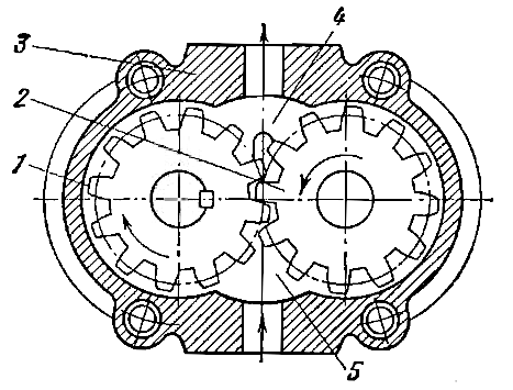 В расточке корпуса 3 насоса расположены ведущая 1 и ведомая 2 шестерни, которые вращаются с малыми радиальными и осевыми зазорами с корлусом и его торцевыми крышками. При врашении шестерен в приемной камере 5 зубья шестерен выходят из зацепления, объем камеры увеличивается и в ней создается разрежение. Жидкость поступает в насос, заполняет впадины между зубьями шестерен, которые переносят ее в напорную камеру 4. Здесь жидкость вытесняется в напорный трубопровод зубьями шестерен, вступающими в зацепление.