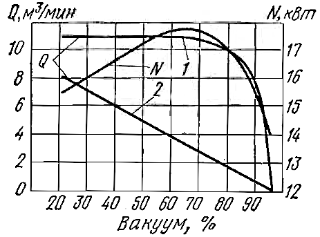 Линией 1 показана подача, отнесенная к условиям всасывания, а линией 2 показана подача, отнесенная к нормальным условиям работы насоса. До значения вакуума 70 % не происходит резкого падения подачи, и только после превышения этого значения она начинает падать; мощность возрастает примерно до такого же значения вакуума и резко падает.