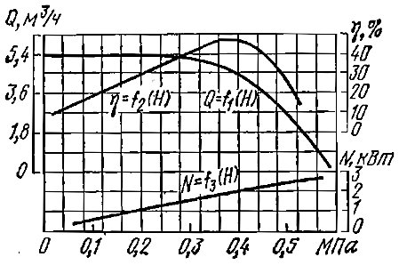 Кривая η = f2 (Н) имеет максимум, показывающий нецелесообразность использования насоса при очень больших и чрезмерно малых давлениях нагнетания. Общий КПД невысок в первом случае по причине больших объемных потерь, а во втором – вследствие малых величин ηг и ηм, неизбежных у любых насосов при малой полезной мощности. Мощность насоса, как показывает зависимость N = f3 (Н), с увеличением напора непрерывно растет.