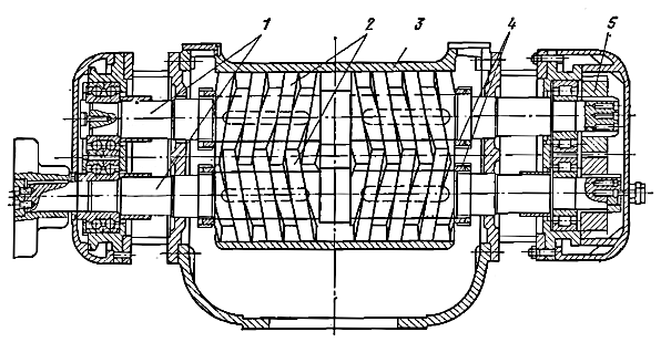 Нарезанные части винтов заключены в обойму 5, в которой они вращаются, как в подшипниках с небольшими зазорами. Для разгрузки винтов от действия осевых сил на торец ведущего винта надет разгрузочный поршень 3, а торцы ведомых винтов вставлены в разгрузочные стаканы 1.