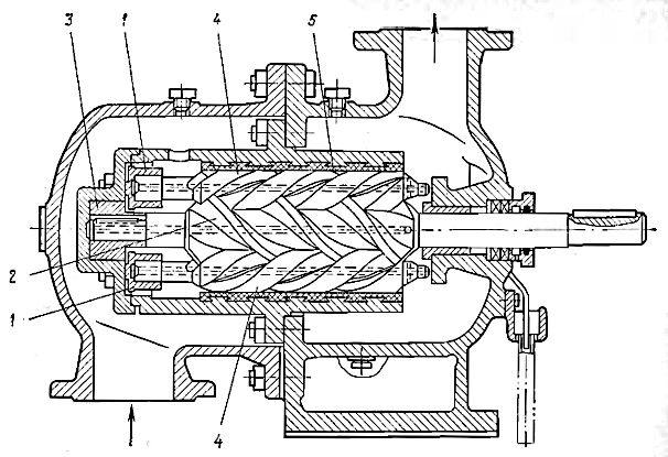 Винтовые насосы относятся к объемным, и подача жидкостей в них производится вращающимися винтами, находящимися в зацеплении. Перекачиваемая жидкость движется в корпусе насоса поступательно и при равномерном вращении винтов подается непрерывно без завихрения и пенообразования. Поступая из всасывающей камеры, жидкость заполняет впадины винтов и, попав в закрытые полости, движется вдоль винтов, а затем выталкивается в нагнетательную камеру.