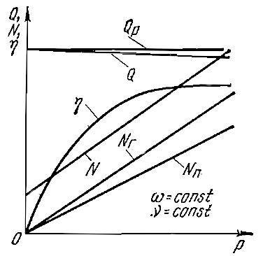 Они предполагают постоянство частоты вращения винтов и р вязкости перекачиваемой жидкости. Расчетная подача Qр не зависит от полного давления, создаваемого насосом, и функция Qр = f (p) изображается прямой линией, параллельной оси P.