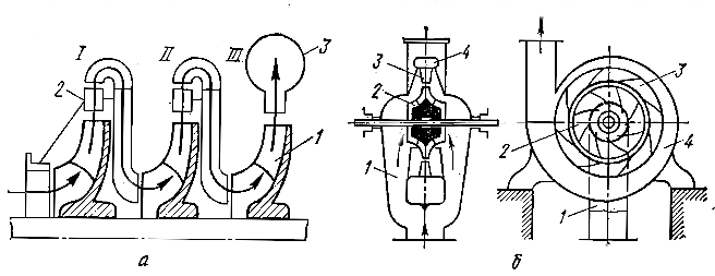 Для получения высоких напоров применяют многоступенчатые насосы, в которых жидкость последовательно проходит через несколько одинаковых рабочих колес 1, закрепленных на общем валу. В этом случае напор повышается пропорционально числу колес. На рис. 2, а показана схема трехступенчатого насоса, у которого поток жидкости последовательно проходит через колеса I, II и III ступеней.