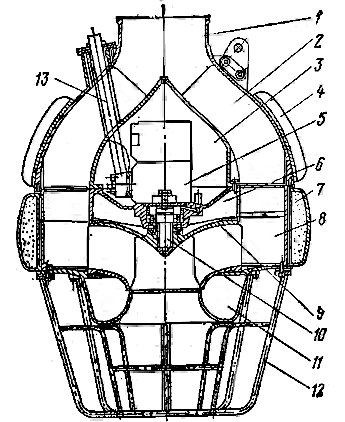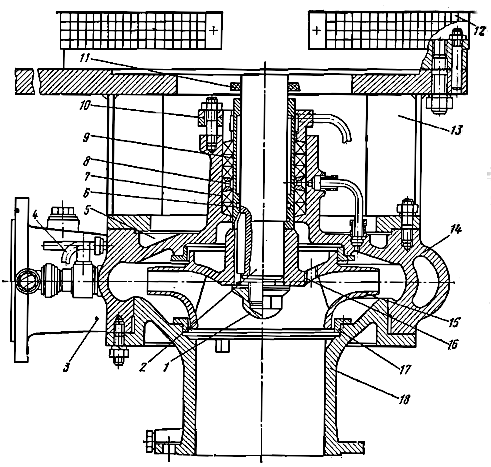 Во входном патрубке 2 установлено рабочее колесо 3, насаженное на вал 7, торец которого закрыт обтекателем 1. Вал имеет две опоры 4 и 10 с лигнофолевыми вкладышами 5 и 11. Нижняя опора смазывается перекачиваемой жидкостью, верхняя 10 – жидкостью, подаваемой специальным насосом. Верхняя часть вала находится в защитной трубе 9. Сальник 12, расположенный в корпусе 13, снабжен мягкой набивкой.