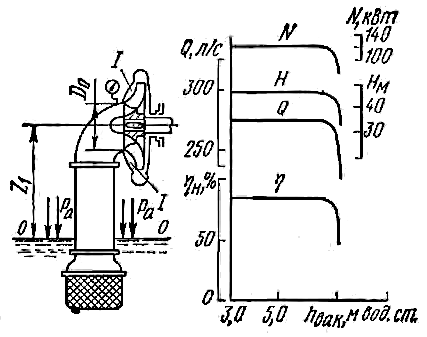Пуск осевых насосов производят только при открытом клинкете на нагнетательной трубе, так как пусковая мощность при закрытом клинкете (Q = 0) примерно на 160-200 % выше мощности при расчетном режиме.
