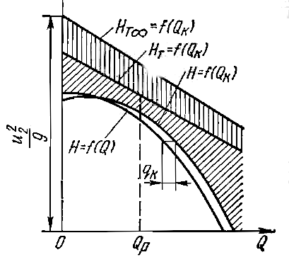 Действительная характеристика насоса. Характеристика насоса, определяющая зависимость между его напором H и подачей Q при n = const существенно отличается от его теоретической характеристики – наклонной прямой. Если допустить, что поправка на конечное число лопастей не зависит от подачи, то зависимость Hт = f (Qк) также является прямой линией. По данным экспериментов, эта прямая практически параллельна прямой Hт ∞ = f (Qк).